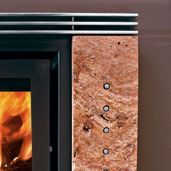 Каминная рамка из Травертина с декоративными "болтами" из полированной нержавеющей стали.